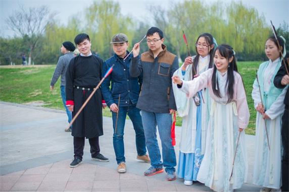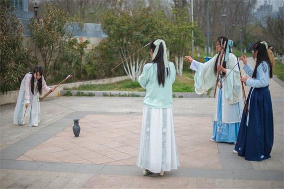 “偷来梨蕊三分白,借得梅花一段香”、“待到山花烂漫时,她在丛中笑”、“疏影横斜水清浅,暗香浮动月黄昏”、“我家洗砚池头树,朵朵花开淡墨痕”……稍作休息之后,同学们毫无倦意,兴致勃勃的开始了“飞花令 猜花名”的小游戏。主持人念起与花相关的诗句,大家围坐在一圈,一边评赏诗词,一边猜测花名。除此之外,汉服社还在草坪附近的空地上准备了木射以及投壶的器材,让过往的路人游客都可以参与到中国传统小游戏中来,体会传统魅力。大家你一言、我一语,你投壶、我木射,现场气氛即欢乐又热烈,原本在草地上放风筝的市民们也兴致大发,纷纷主动加入到游戏的行列中来。见到此情此景,更有不少在龙子湖取景的摄影师走上前为大家拍照留念。汉服爱好者、摄影爱好者、风筝爱好者、路过市民一时间不分彼此,大家原本志趣各异,却在这样一个融融春日,通过花朝节、通过汉服、通过诗词、通过中华传统文化、通过对汉民族的深深认同,建立起一瞬亲密的情感链接。