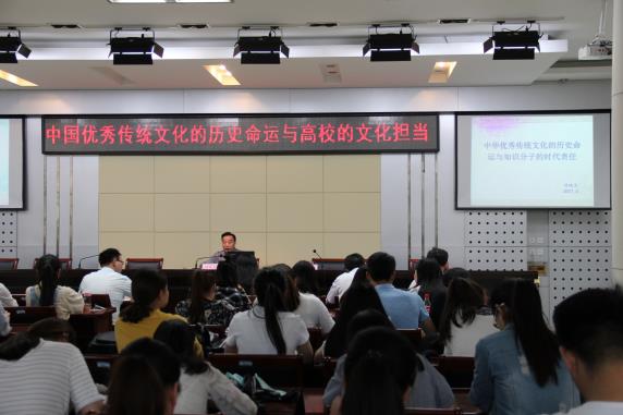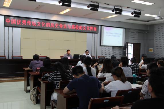 项纯文从七个方面探讨了中华传统优秀文化的兴衰历程。第一:“千年修道”。我国作为统一的多民族大国,爱国主义精神是我国悠久而又从未中断的历史传承,既源远流长也博大精深;第二:“百年乱潮”。近百年以来,中国出现了一股怀疑、反对、抛弃、破坏中国优秀传统文化的浪潮,如五四运动时期的“打倒孔家店”,和建国后发起的一波又一波的文化批判运动直到文化大革命;第三:“黄钟毁弃”。指出糟粕的文化如同小人当道,人才无用武之地,而无才德的平庸之辈却居于高位;第四:“瓦釜雷鸣”。自改革开放以来第一个因贪污腐败被枪毙的县委书记,到现今中国官员的贪腐传奇是极为惊心动魄的,是令人完全无法理解,匪夷所思的。不仅如此,社会公德的崩溃还体现在有法不守、有规不依,社会风气出现冷漠、恐惧、浮躁、暴戾等现象;第五“惊蛰春风”。回顾了历任中共中央总书记对传统文化的态度,特别强调习近平总书记对中华传统文化的态度,要求干部要学习中国优秀传统文化,要终结百年乱潮,并且身体力行带头示范,继承传统,梦想未来;第六“弘毅重任”。古人云“士不可以不弘毅,任重而道远。”新一届领导人更加注重传统的优秀文化,认为传统的优秀文化将成为社会经济发展的重要支柱;第七“重要建议”。弘扬传统文化要在”优秀”上下功夫,要继承精华也要批判不足,指出当代大学生更要融入人类发展的大潮流。讲座内容深入浅出,参会人员认真学习记录并就有关问题进行思考和讨论。最后,吴长法作了总结发言,高度肯定了讲座的价值和意义,并和大家一起倡议,传统文化是中华民族的精神支柱,一定要传承和发扬中华民族的优秀传统文化,真正履行自己文化担当的责任。