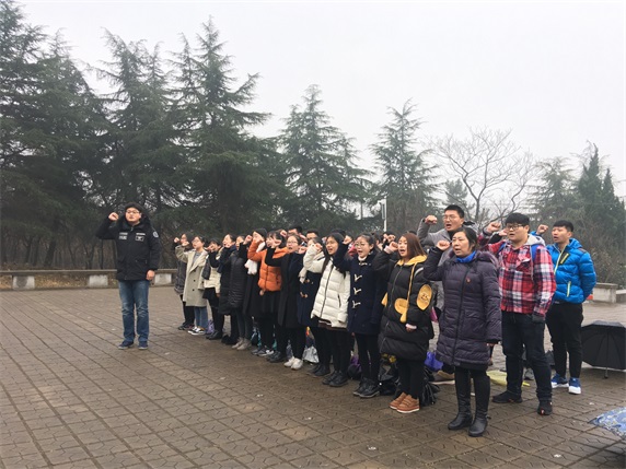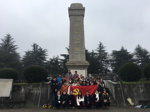 12月14日上午十时,文学与教育学院学生第一支部的全体党员在支部书记潘兰香的带领下,冒着零星小雨乘坐115路公交抵达蚌埠市烈士陵园。组织委员刘鑫领着支部党员们面对党旗,举起右拳,一起重温入党誓词,党员们铿锵有力的宣誓声回荡在纪念碑下,党旗在雨中显得格外鲜红。
