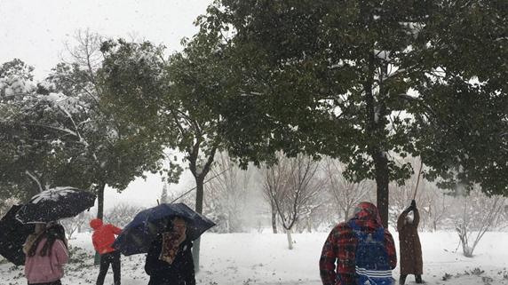 近两日,蚌埠地区出现大到暴雪天气,校园内树木积雪情况严重,容易引发危险。为预防校园安全隐患,保护校园树木,2018年1月4日,文学与教育学院学生第一支部党员在支部书记潘兰香老师的带领下,开展校园树木积雪清除活动。