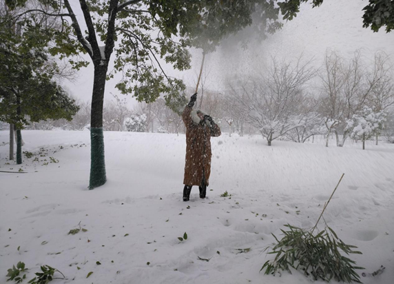 1月4日下午两点,文学与教育学院学生第一支部党员在支部书记潘兰香的带领下,冒着寒风和霜雪,踩着一尺多厚的积雪走进校园,走近树木,用竹竿等工具奋力地将树枝上的积雪打落,在活动中,潘老师亲历亲为,带领同学们努力清理树枝上的积雪,经过大家两个多小时的努力,校园内的树木得到了及时的清理。看着重新舒展枝丫的树木,大家冻得红彤彤的脸上露出了灿烂的笑容。